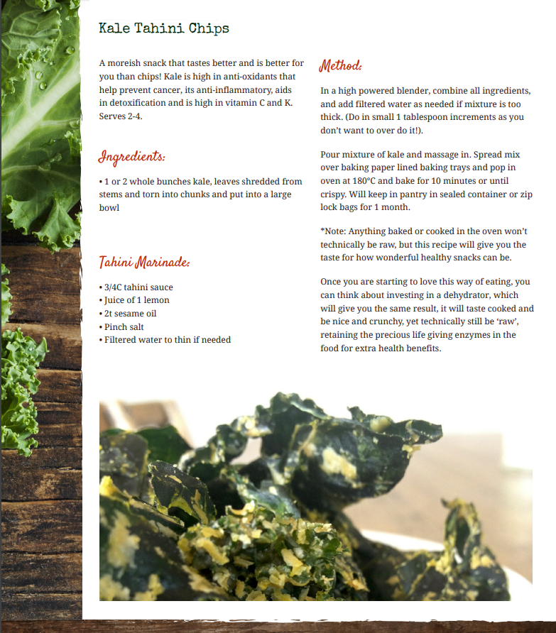 In the meantime, I am sharing two of my favorite take-away recipes from my friend Amanda over at Raw Food Kitchen in New Zealand. She is also a whiz in the kitchen and makes her own dressing for this Kale Chip recipe. Keep in mind, there are many dressings you can massage into kale to make kale chips, but I prefer homemade dressings and sauces to store-bought whenever possible because I know exactly what I am getting.